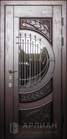Входная коричневая дверь в частный дом со стеклопакетом и ковкой №11