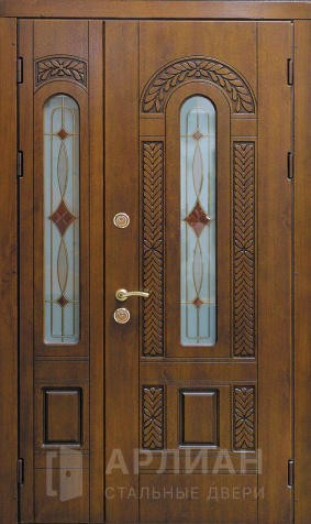 Двухстворчатая входная дверь со стеклом и ковкой №9